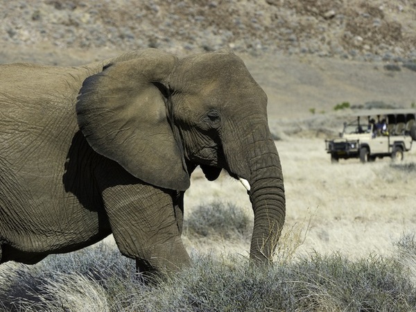 Activities include nature drives and gided walks to absorb the spectacular views and desert scenery. Rare succulent plants somehow manage to eke out an existence in this harsh landscape, and the wide-open terrain may reveal sightings of the rare desert-adapted elephant, gemsbok, springbok, ostrich and other hardy desert animals. Lion, cheetah, and spotted and brown hyena are also seen here, as are endangered black rhino and bat-eared fox. The area also boasts excellent birdwatching, with more than 240 species in the surrounding conservancy, including raptors such as martial eagle, lappet-faced vulture and pale chanting goshawk. A highlight is the fascinating expedition to Twyfelfontein, recently proclaimed a World Heritage Site, with its renowned San art engravings, and the largest collection of petroglyphs—prehistoric rock art—in Africa. A visit to the Damara Living Museum reveals the rich traditional culture of the local Damara people.