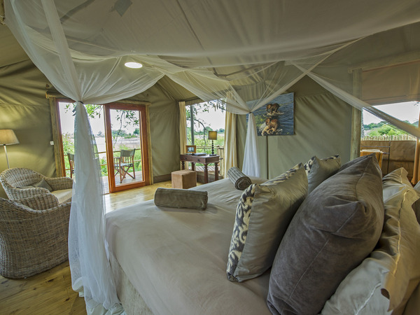 Located on an island surrounded by a seasonally inundated floodplain and papyrus swamps, Jacana Camp consists of five Meru-style tents built on raised wooden decks, with panoramic views of the Okavango Delta. Each tent has an enclosed en suite bathroom featuring a roofless shower, which is lit by dappled sunlight or by the stars at night. Multiple windows ensure excellent wildlife viewing from the cozy seating area or from the double beds. The main dining area sits on an elevated platform between two magnificent sycamore fig trees and is surrounded by wild date palms. Jacana Camp also features a relaxing bar and lounge with an area for open fires under the stars. A plunge pool offers a chance to cool off in the midday sun.