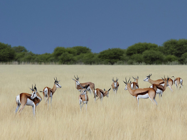 Antelope tend to migrate into the central and eastern Kalahari deserts following water and grasses between December and April, often followed by predators. During the driest months from June to October, the landscape hosts fewer large mammals but the most commonly viewed animals at this time may be gemsbok, springbok, red hartebeest and steenbok and a number of other small mammals, birds and reptiles. Exact sightings will depend on weather and wildlife movements.
