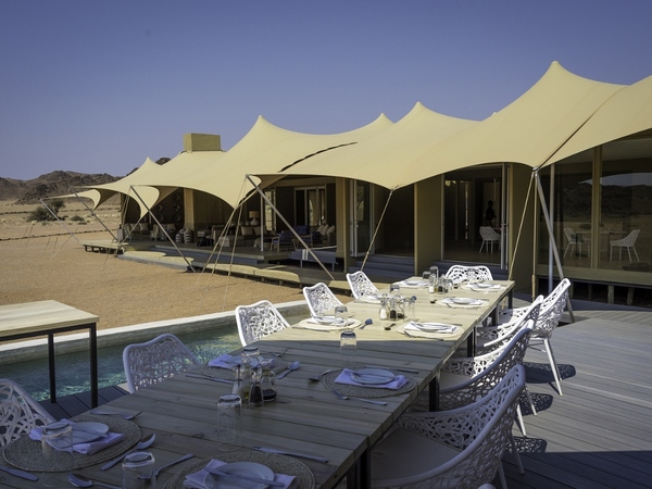 Hoanib Skeleton Coast Camp lies in a scenic valley at the confluence of two tributaries of the dry Hoanib River. Its location, set within the northern Palmwag Concession, abuts the iconic Skeleton Coast National Park in one of the most remote areas of the Kaokoveld. The exclusivity of this area is undeniable, as the camp is accessible only by light aircraft and consists of just eight spacious tents, including a family unit. Each tent has a comfortable bedroom with a view of the desert through glass doors, a small desk and sitting area, an en suite bathroom with hot and cold running water, and a private veranda that forms an outdoor living area with plush seating and tables. The camp mimics the desert with draped canvas evoking the appearance of sand dunes, and living areas in earthen tones that create a flow of space to the outdoors. The central living and dining areas are spacious and also feature a lap pool for a cooling dip at midday. The camp overlooks rugged hills on either side and blends seamlessly into its environment.