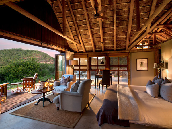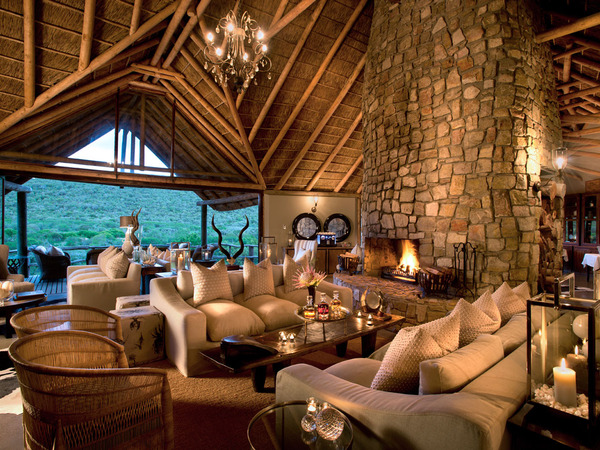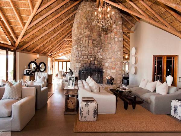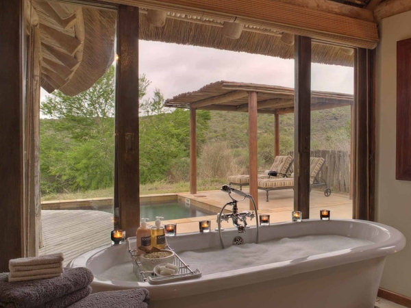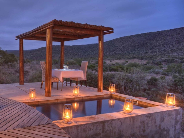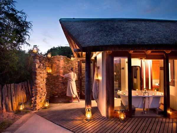 Kwandwe Great Fish River Lodge offers nine spacious and luxurious suites in an intimate setting from which to enjoy the surrounding wilderness in comfort. Floor-to-ceiling glass doors fold back so that your living space flows out onto your private wooden deck, where you can observe animals quietly passing through camp or making their way to the river to drink. En suite bathrooms have a tub with a view and both indoor and outdoor showers. A private plunge pool is an added touch of luxury that's welcome on warmer days. The central areas of the lodge are situated beneath high, thatched roofs, with plush sofas and stone fireplaces that set the stage for gathering each evening. A stone-walled boma creates a comfortable outdoor setting for al fresco dinners on clear nights.