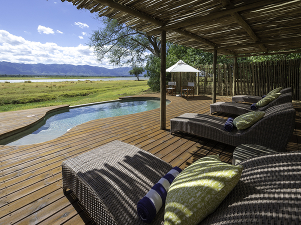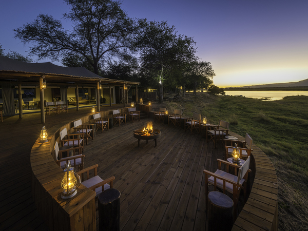 A magnificent view of the Zambezi River and floodplains unfolds before each of the luxurious tents at Ruckomechi Camp. Enjoy the private vista from your bed or shower—there are often hippos, elephants and other wildlife in view. These superb tents are furnished in opulent safari style with leather chairs, writing desks, heavy linens and en suite bathrooms with copper wash basins and both indoor and outdoor showers. Stone is featured prominently in the decor, and cobblestone walls divide the interior spaces. One of the highlights of the camp is its outdoor claw-footed “tub with a view” in a secluded, scenic spot for languid soaking. Common areas include a central dining tent, bar, library and lounge with comfortable sofas and oriental rugs. All of these face the escarpment and offer prime wildlife viewing. A deck with infinity pool beckons during siesta time, while a cushion-strewn stargazing deck offers a delightful evening gathering area beneath the night sky.